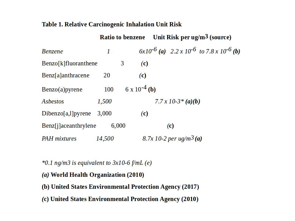 The World Health Organization (Choi et al, 2010), and United States Environmental Protection Agency (2017) have determined the Inhalation Unit Risk for Benzo(a)pyrene, asbestos and benzene. Relative potency factors have been determined by United States Environmental Protection Agency (2010). Some of these values are shown in Table 1.