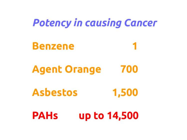 With potencies greater than Agent Orange for causing cancer from food and water, and up to 10 times greater than abestos when inhaled, PAHs pose a huge threat to public health. Link scientific evidence – 7